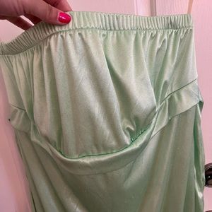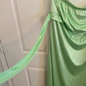 Dress is sparkly green. Has tie around the bottom of bust. Never worn. Bought for an event and never wore. Still has tags. Great for dressing up, kind of thought it would be perfect for a fairy costume for Halloween!!!