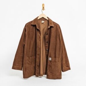 Both sides have zip pockets at the front/hips. Wool rib knit collar cuffs and hem on both sides. The collar zips all the way up into a turtleneck for extra chilly days.