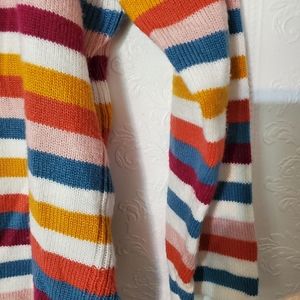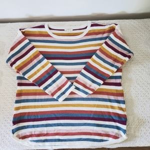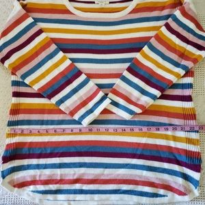 Really soft colorful sweater white, orange, blue, burgundy, pink, and yellow stripes. Stylish AND comfortable! Brand is Westbound woman size is 1x