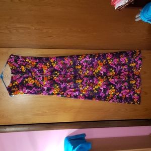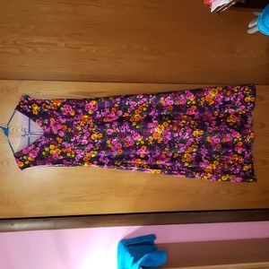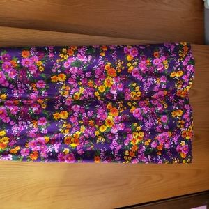 *This fabulous example of flower power features a v neck, empire waist, bust darts for a flattering fit, & an A line maxi skirt, all in a bright bouquet of pink, purple, white, and yellow&orange flowers with green leaves over a purple background.