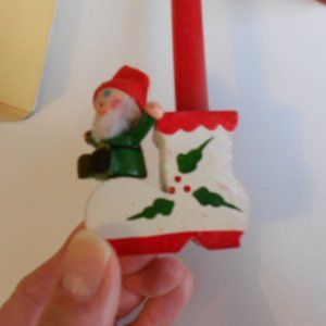 Small wooden elf candle holders boot shaped 2 1/2" tall, by 2 1/4" length. Candles are 3 1/2" tall, never burned.