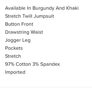 Khaki one piece easy to wear jumpsuit. Can be worn with heels or flats. Comfortable. Stretchy. Size Large. Never worn.