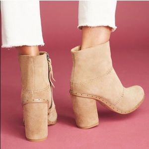 Pre loved with some tarnishing to the studs. Silver hardware. Interior side zip closure. Rubber sole. Comfortable chunky heel. Leather exterior.