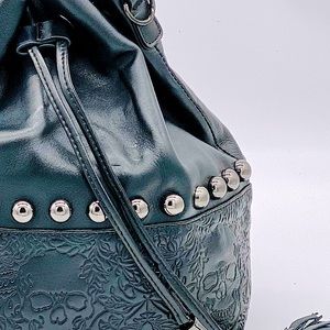 Any everyday essential, this soft Italian Leather Cross Body Bucket Bag can also be worn as a backpack. Featuring an intricate skull embossed print leather base topped with gunmetal dome studs, The Bag is both minimalistic and a statement piece.