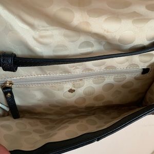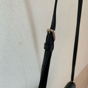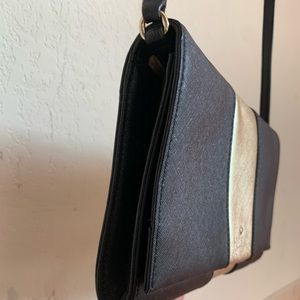 Super cute Kate Spade crossbody bag that can convert into a clutch! Black material with vibrant gold racing stripe around it. I love the colors & think they're still in good shape! Snap close that's a little frustrating. Polyester lining. I don't do cleanings or anything, but I think this prob just needs some sprucing from someone who likes doing that & it'll be in great shape! (in my non-professional opinion lol)