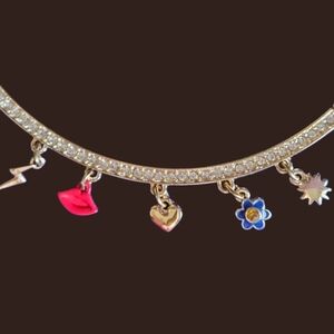 This is Lovely pair of Betsey Johnson Push-Back Stud Dangle Earrings. One Earring Dangles the Moon at the Bottom, and the Other Earrings Dangles a Star at the Bottom. These Earrings are adorned with Beautiful Red Rhinestones and Clear Rhinestones. The Earrings are Lightweight. Gold-tone Hardware.
