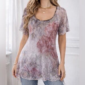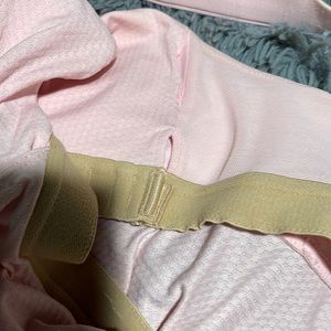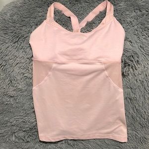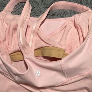 Lululemon light pink cross back tank top with built in bra (adjustable chest sizing to cinch under breasts). Beautiful tiny ruffle/scallop detailing and satiny straps shown in closesups. Discontinued style. The shoulder straps have a thin band of matching reflective material on them. This top had been worn and may have slight color variations/stains that are not obvious while wearing.