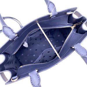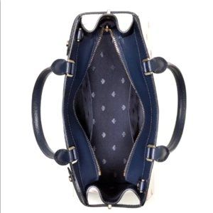 ADORABLE! Navy logo sateen interior. Top zippered closure. Adjustable, removable leather crossbody strap; dual rolled leather satchel handles. Two exterior slip pockets, interior zippered pocket and slip pockets. All you need for a concert, shopping, or travel. GORGEOUS, eye-catching bag all in PRISTINE condition, original packaging: No wear, no stains, no tears, no smells, no damage. Smoke free. MSRP: $399, plus tax.