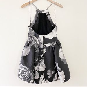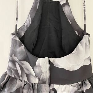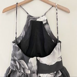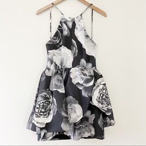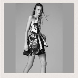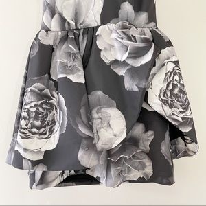 The alone tonight dress is a high-necked dress with a fitted bodice and thin strap detailing. The dress features a full flared skirt, raised at the side front with a fitted under skirt. The dress is available in the exclusive cameo monochrome rose print. Fit and flare dresses are ultra form-flattering, but this particular dress is exceptionally special because of the peplum detail. The blown out floral print gives it a unique contemporary take that is unlike any other dress out there.