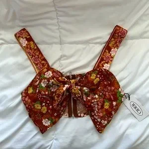 This top is brand new and still has the tag attached. The top can be tied in the front or not, up to you. The material is great and it comes with a zíper on the back. This is a medium size.