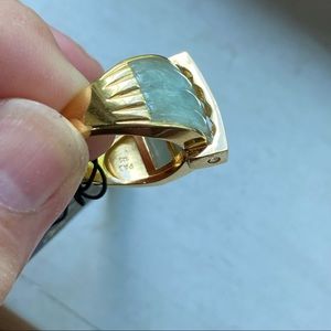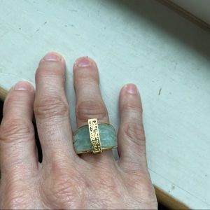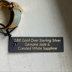 Lovely jade ring, a beautiful soft green with scroll work and created sapphire, stamped, new, 18k gold over sterling, approximate size 6.5