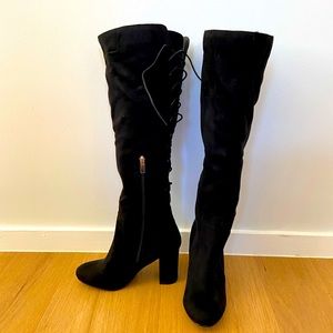 Lace up on the back, small gold zip on the inside. Super comfortable and wide calf, so easily fits over jeans. A fantastic plus sized boot. Size 39.