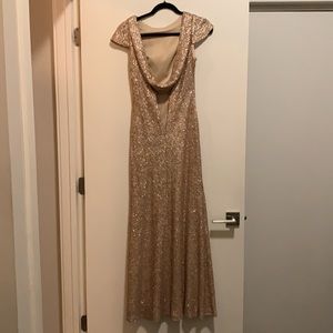 This dress was worn once for a bridesmaid dress! It is beautiful, well made, and fit perfectly. It was shortened about an inch in alterations to work with my height (5’6).