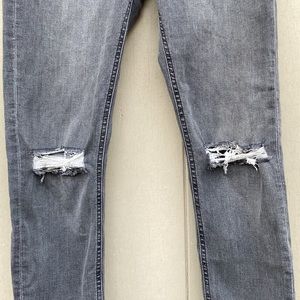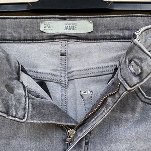 Topshop “Jaime” jeans with distressing on the knees. High waist skinny fit. Gently worn soft and comfy denim. Zipper and button closure. Front and back pockets.