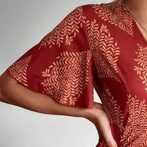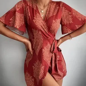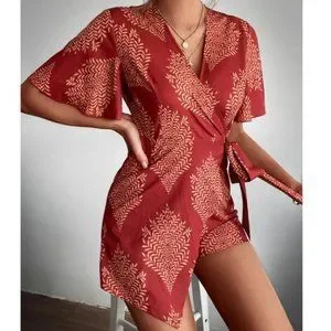 Boho Tropical Print Butterfly Sleeved Mini Romper burgundy red