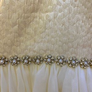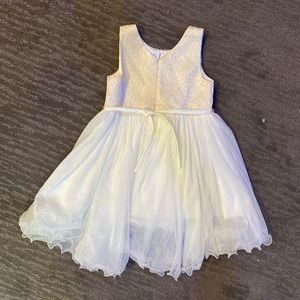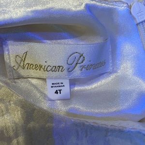 worn once for a wedding. Brand is American princess. Size is 4t. Style is shorter in the front and longer in the back. Up close picture shows color. It’s definitely a more yellow ivory than a white ivory
