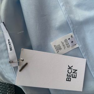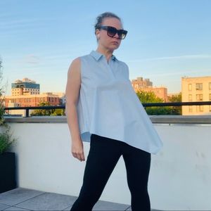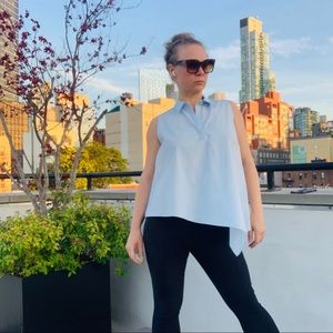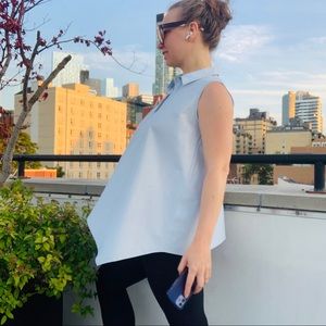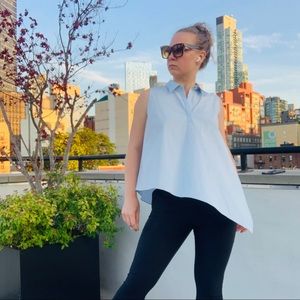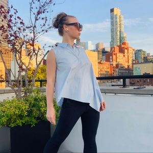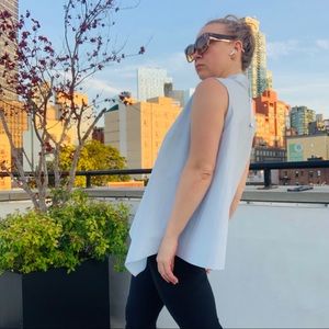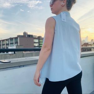 BECKEN Asymmetric One of a kind Sleeveless Solid Baby Blue Sky Light Blue Blouse Standing collar button down style upper pull over crisp wrinkle resistant organic cotton