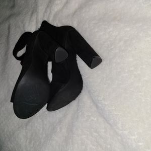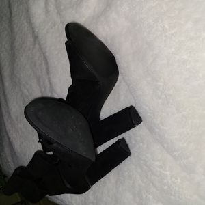 These have a 4.3 inch faux suede heel. They are open toe. They have 3 stretchy bands in the fronts. They have a zipper on the inner side of the booties. The material feels like a sock. Very little ware. Accepting fair offers. I ❤️ offers