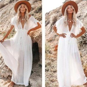 Summer dress white long dress white cotton dress boho maxi dress free people dress anthropologie dress button down maxi dress button down white dress white beach cover up white gauze bikini cover flutter sleeve dress drawstring waist dress gathered waist dress distressed hem dress fringe hem frayed hem dress cinch waist dress open back dress backless dress cut out boho dress sheer white maxi dress relaxed fit white dress