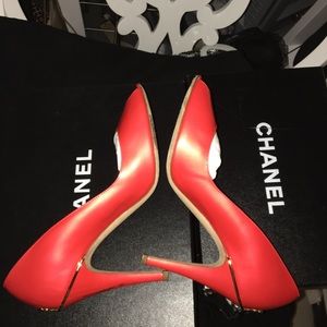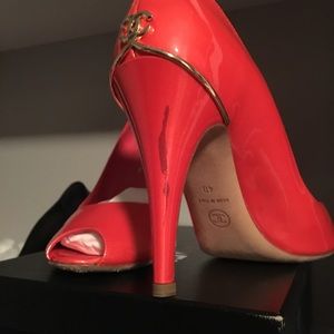 Chanel Coral Red Gold CC peep toe Heels