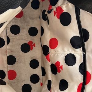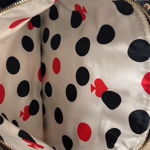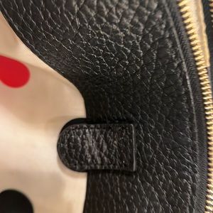 Gently used Kate Spade Leather Bag . Black with gold hardware. Outside is excellent used condition. Inside bottom of bag has some markings from makeup. Outer two zippered sections clean and excellent used condition.