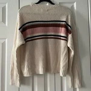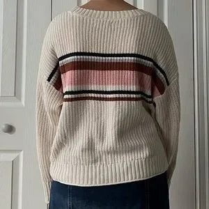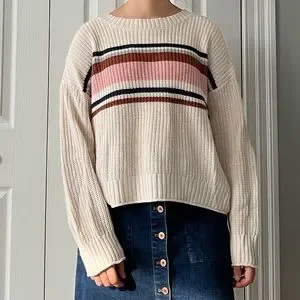 A thin loose-fit sweater. It’s a cream color with blue, brown and pink strips toward the middle. It is in a good condition and a size M.