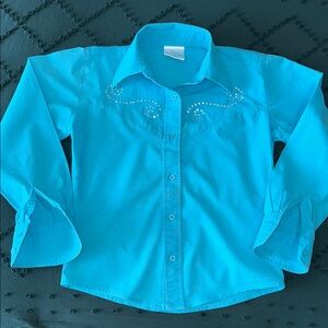 This blouse is burgundy color. It is long sleeve with the option to roll up sleeves and button close. It is very gently pre loved.