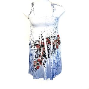 American crown tie shoulder dress in white, baby blue and red large print flower. Midi length. With super stretchy tube style bust. Light weight and perfect summer dress of cover up. Size XL 100% polyester. In excellent condition!