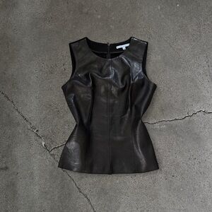 Vintage Moschino crisp white blouse featuring sleeveless silhouette, bow, button down front, slightly flared at the hips. Super unique fabric that’s reminiscent of reflective snakeskin. Immaculate condition, marked size IT 44 / 6