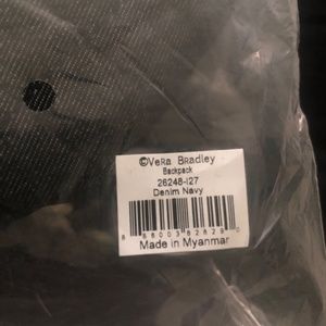 Vera Bradley brand new (in package) Denim Navy backpack. Large center compartment, two side pockets, cushioned adjustable straps and a convenient front pocket for easy access to phone/ headphones/ keys etc. Non smoking/ no pet home. Dimensions: 15.5 inches long/ 12.5 wide/ 5 inches deep (see also photos).