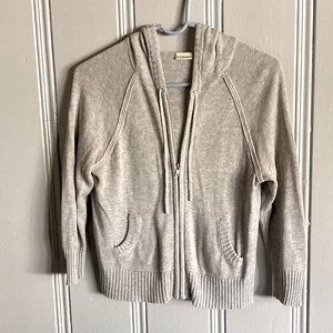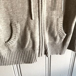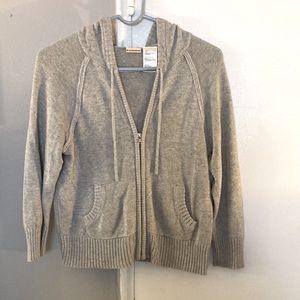 Super soft and cozy gray knit zip up crop length sweater with hood and pockets. Has a nice stretch to it to.