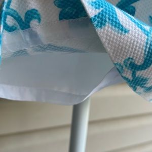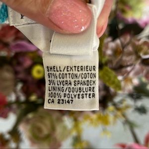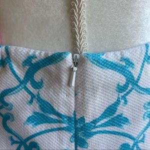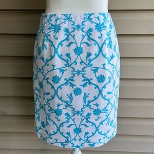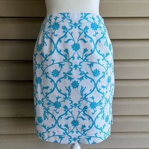 This is a fresh, classic pencil skirt from Talbots, size 6P. The woven pique fabric, 97% cotton/3% spandex, is white, with a vine/floral pattern in shades of turquoise. Features a slit on the left side and concealed side zipper closure. A great career piece!
