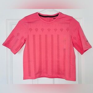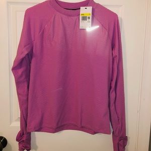Pink and black New Balance pull over wind breaker with quarter zipper. Waist pocket. Elastic you can tighten at bottom. Has hood. Light weight, water and wind resistant. Size small. New with tags.