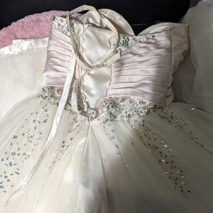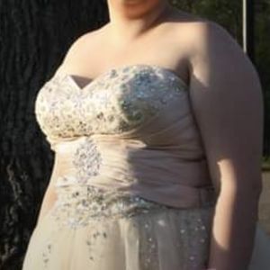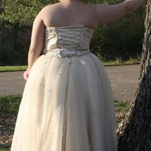 this is a size 18 prom dress that was worn one time and has been kept in a closet in a dress bag. this dress has been hemmed to fit someone 5'3"