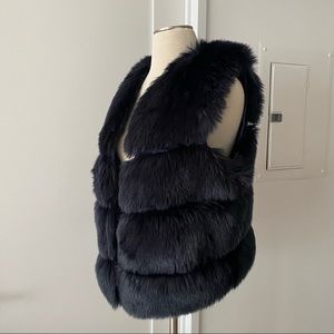 Popski London "Faye" Nnavy blue faux fur vest. One size. Features one pocket on each side and hook and eye closure. Fully lined.