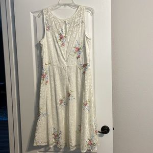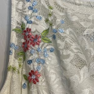 This dress is all lace with pink and blue embroidered flowers on it. It is sleeveless. It comes with a self lining. It has belt loops for a belt but does not come with a belt. It has a back zipper and hook and eye. It is a size 16. Never worn.