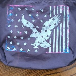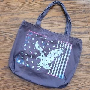 Cloth bag from American Eagle Outfitters. Gray with white eagle and American flag design on front. Also has touches of blue and pink color.