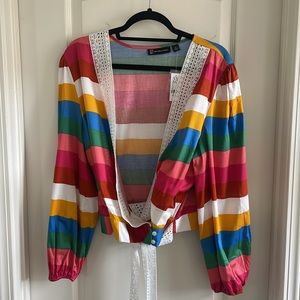 This wrap top brings a vibrant twist to everyday style, designed with mutlicolor stripes and a flattering fit. Its eyelet trim and bow-tie waist elevate the appeal.
