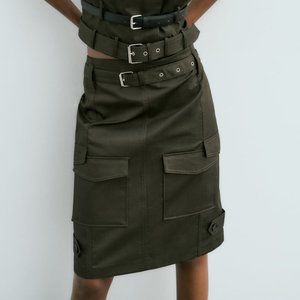 Closure with snap buttons at bottom and hidden in-seam zipper at side.