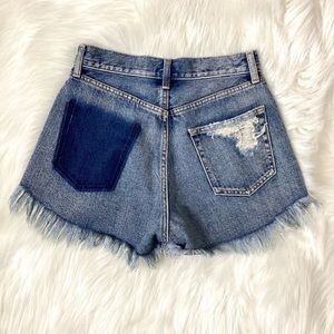 MOUSSY Loose Damage High Rise Distressed Shorts, SIZE 2. High rise, non-stretch denim with intentional rips and distressing, raw frayed hems, 5-pocket styling and a button fly closure.