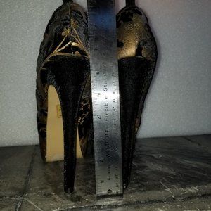 These would be an amazing addition to your spring wardrobe. Paper Fox never disappoints with their heels. These are so close to 7 inches tall. This is a really cool design called Yoko with a somewhat Oriental pattern in black velvet and gold inlay. I am including the original ankle straps even though one has a defect. They still work but one is missing the loop to retain the strap tab past the buckle.