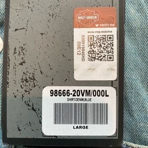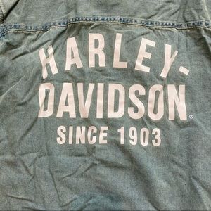 Features button up front, buttoned chest pockets, factory distressing, and Harley Davidson wording on the back.