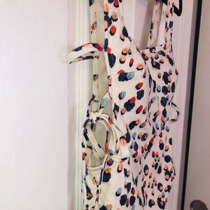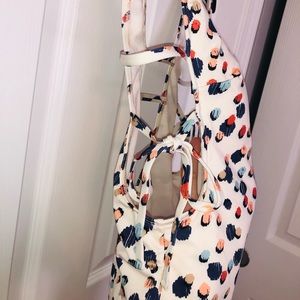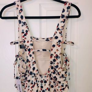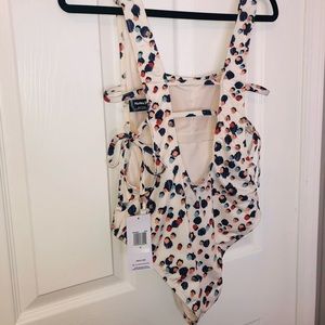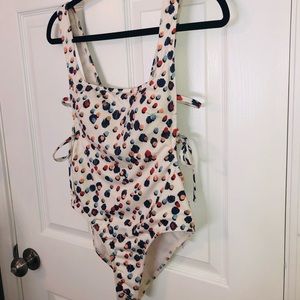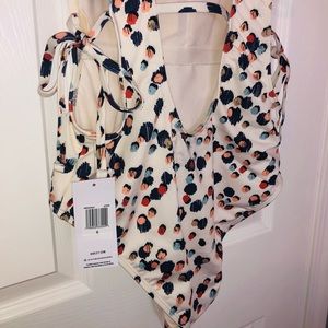 Creamish colored one piece with peach, light blue, red, navy, and tan polka dot Hurley bathing suit. Cut out sides with straps and ties. Low cut back with straps. Size small. New with tags.
