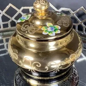 Czech Bohemian Powder Jar Purple Gold Gilt Art Glass Box Flowers Elegant #A23