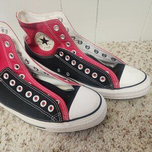 groovy shirt, 100% cotton, navy with pink, brand new with tags made by Elie, button front with square pink buttons, no pockets, double barrel cuffs, spread collar, slightly rounded tail, solid pink inside collar and cuffs, original hang tag and price of $149.50