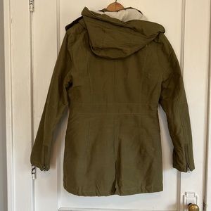 Olive green quilted and fleece lined like new Northface coat. Super warm! Only worn a handful of times. Size M, but if you plan on layering might fit more like a S.