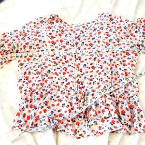Floral and lace- my two favorite things in a blouse. Loose fitting with tie waist. Little wooden buttons. Lace detailing. Ruffled bell sleeves. Love it!