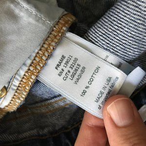FRAME Denim Le Grand Garcon jeans with a ripped knee detail. Medium/dark wash denim. There's some fabric wear at the inner thigh (see close-up).