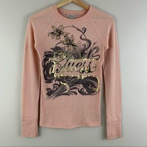 GUESS Vintage Y2K Light Baby Pink Gold Floral Fitted Graphic Long Sleeve Top