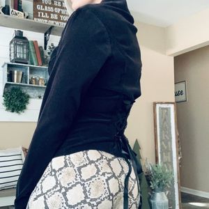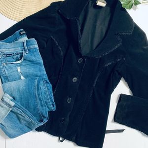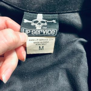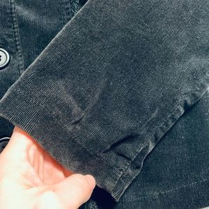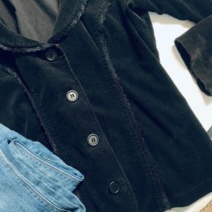In good used condition. Channel the inner 90s with this Hot Topic Lip Service black velvet corduroy jacket. Ties up the back to adjust tightness in the midsection. Lower cut. Has small spot on collar and some very minor discoloration on sleeves that is barely noticeable. Size medium